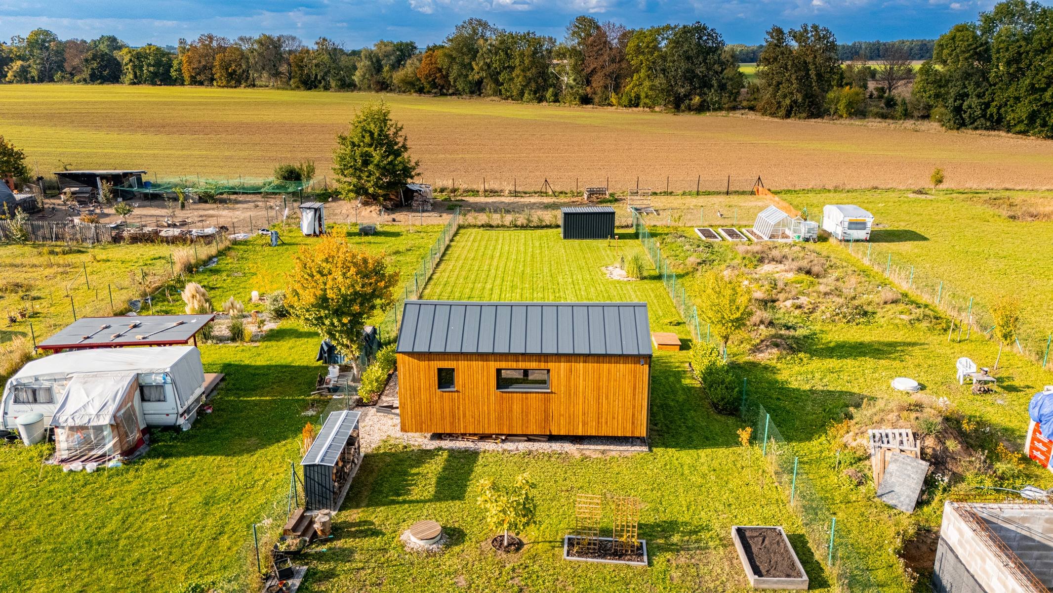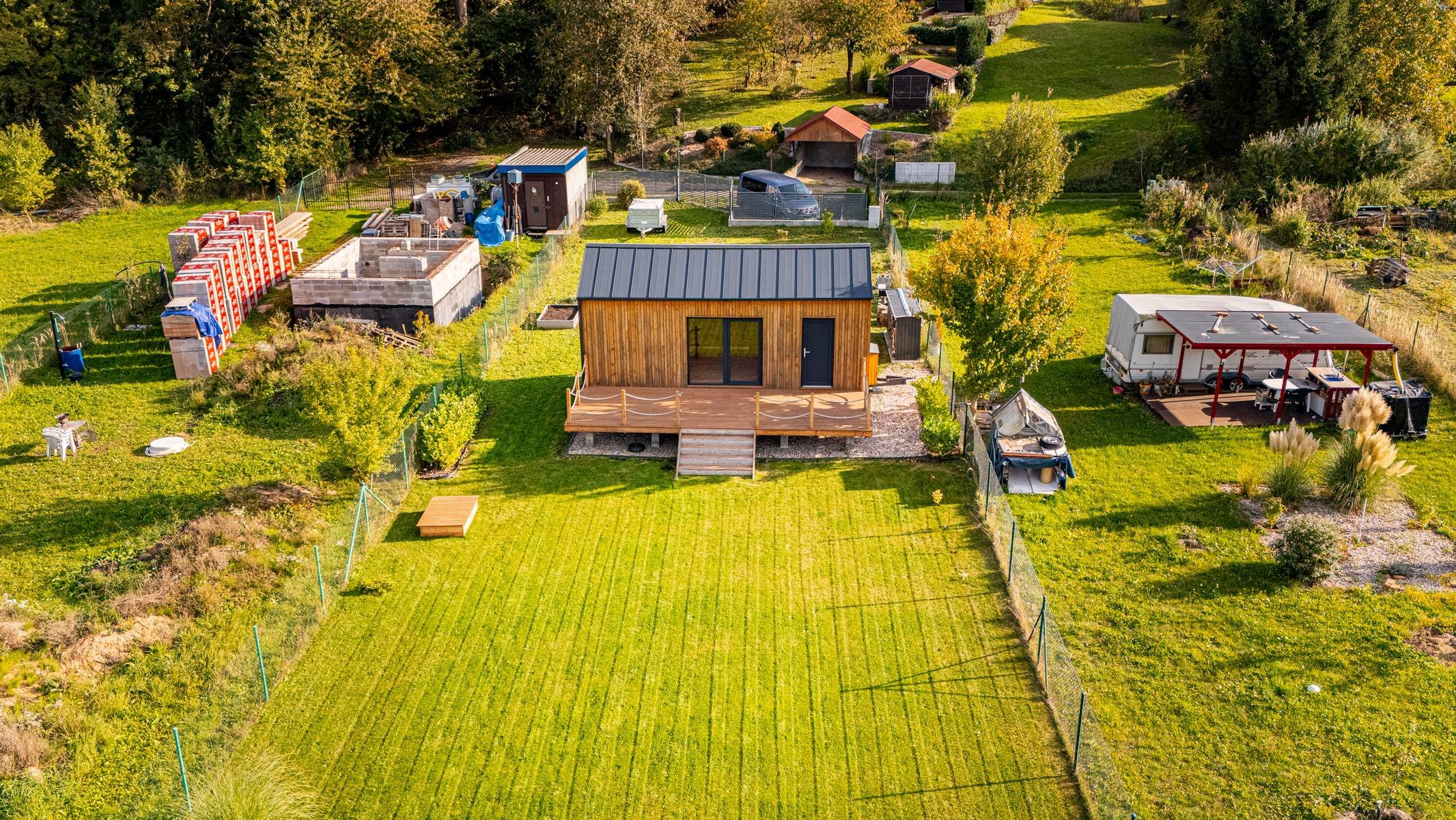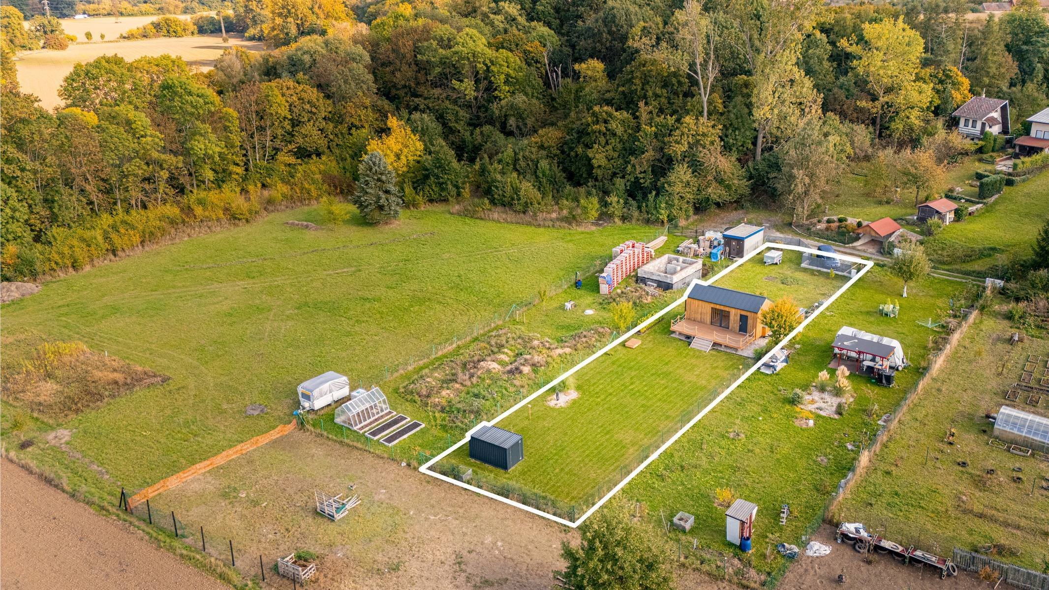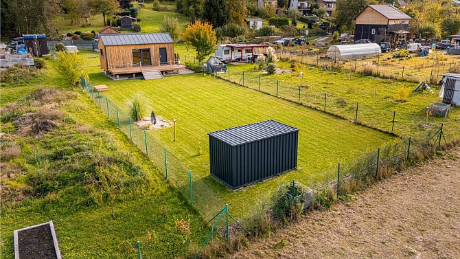 Pozemek je rovinatý, oplocený a přístupný z obecní komunikace. Na pozemek je přivedena elektřina, následně rozvedena do Tinyhousu, úložného kontejneru a k čerpadlu ve studni. V roce 2022 vyvrtán vlastní vrt o celkové hloubce 27m. Voda ze studny je přivedena do rekreačního objektu a do zahrady.